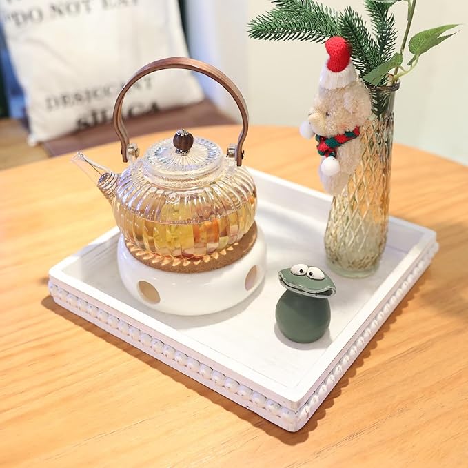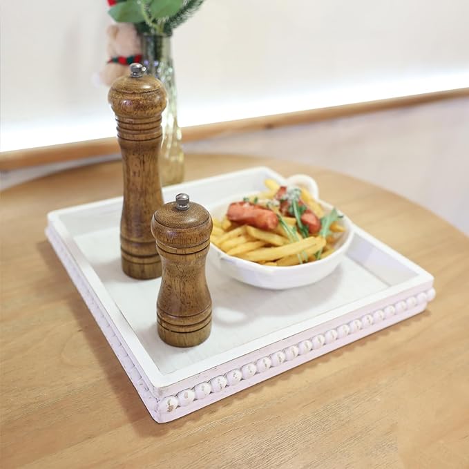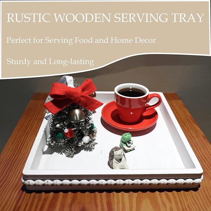 Square Wood Decorative Serving Tray, Rustic Coffee Table Tray for Ottoman,Kitchen Counter Organizer, Bedroom, Home Decor(Whitewashed)