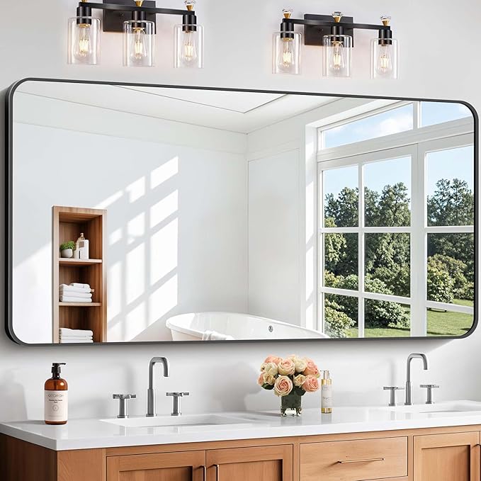 - STURDY ALUMINUM ALLOY FRAME: This bathroom vanity mirror features black aluminum alloy frame, which is sturdy, durable, and antirust. the surface has been treated with special anti-corrosion treatment, so it can be used for a long time in bathroom humid environments.