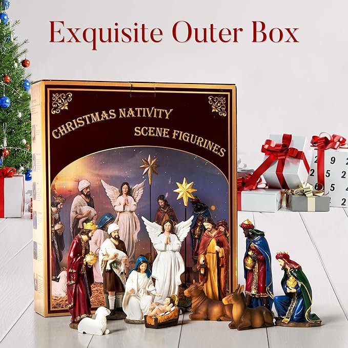 - π Artistry in Every Detail: Beyond being mere decorations, our nativity sets are true works of art. Painstakingly hand-painted with precision, these cast resin figurines exude exceptional quality, making them a valuable addition to any collection.