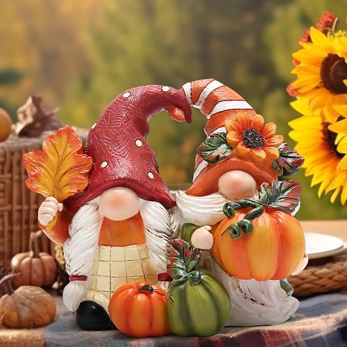 - Thanksgiving Autumn decorations - In this heartwarming Thanksgiving scene, Couple elves bask autumn sun in the autumn . The girl gently held a maple leaf in her hand, its veins shone with a faint red light in the sun, as if it was the condensation of autumn magic. The boy is holding pumpkins, big and small, orange and dark green. Every pumpkin is a symbol of autumn harvest and their bright future. The sunflowers on the hat radiate a warm glow, as if the love between them blooms in every color.