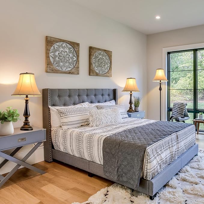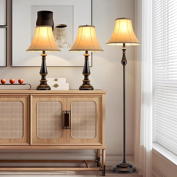 - [DURABLE & STABLE CONSTRUCTION]: This 3-piece lamp set consists of a high quality all-iron base, all-iron lamp stand and fabric lamp shade. The heavy base is stable and not easy to tip over even when touched, the all-iron stand is sturdy and not easy to bend and deform, and the high-quality fabric lampshade is supported by the stand, which is not easy to fall apart and not easy to poke