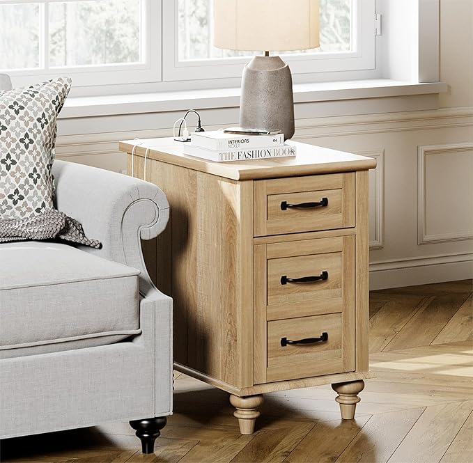 WAMPAT Farmhouse End Table with Charging Station, Light Wood Sofa Side Table with Storage Cabinet, Narrow Night Stand Bedside Table with Drawer for Living Room, Bedroom, Oak