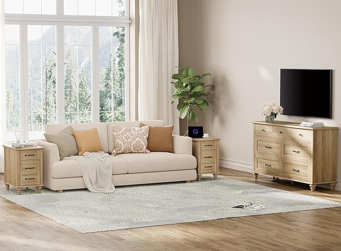 - 【Farmhouse End Table with Charging Station】 The off white nightstand with a charging station is equipped with 2 standard AC sockets and 2 USB interfaces. Charge mobile phones, lamps and other devices at any time. Power cord length :6.5 ft. It is also worth mentioning that the distance between the bottom plate and the floor is large enough to allow the robot vacuum cleaner to pass freely.
