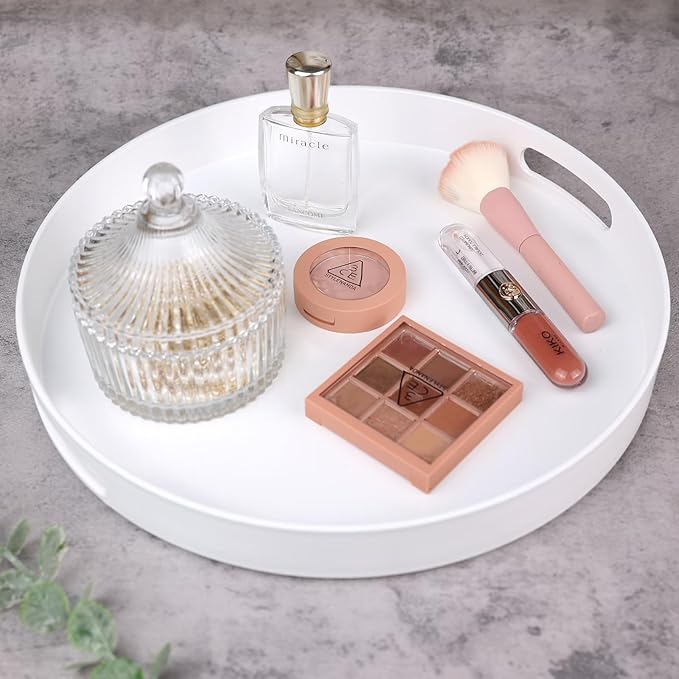 Round White Decorative Serving Tray with Handles, 13” Versatile Ottoman Tray for Coffee Table, Entertaining, Outdoor Patio, Living Room