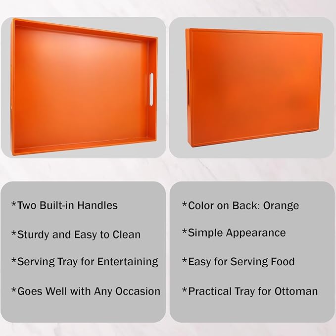 Ornage Serving Tray for Coffee Table, Rectangular Plastic Decorative Tray with Handles for Entertaining, Outdoor Patio, Living Room, Ottoman, Bathroom Counter, 11.8”*15.7”*1.6”