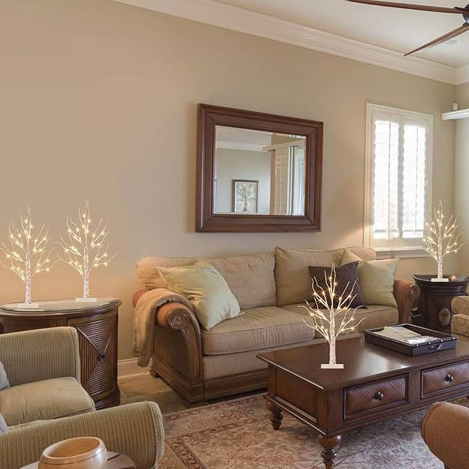Vanthylit Christmas Tree Decorations, White Birch Tree with LED Lights- Set of 4, Warm White Small Tree Lights Battery Powered/USB, Timer Lighted Tree for Home Wedding Indoor Outdoor Decor (2 FT)