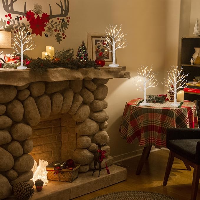 - Lighted Birch Tree : This 2 FT tall birch tree light with a 4 inch x 4 inch base and 24 warm white LED lights looks simple and elegant, making it a perfect addition to create a festive atmosphere for holidays
