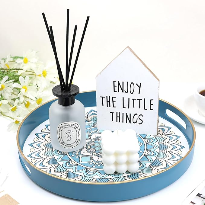 Round Cyan Decorative Tray for Coffee Table, Ottoman, 13” Plastic Serving Platter Tray with Handles for Entertaining, Living Room