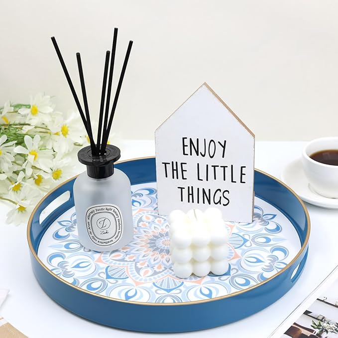 Round Blue Decorative Tray for Coffee Table, Ottoman, 13” Plastic Serving Platter Tray with Handles for Entertaining, Living Room
