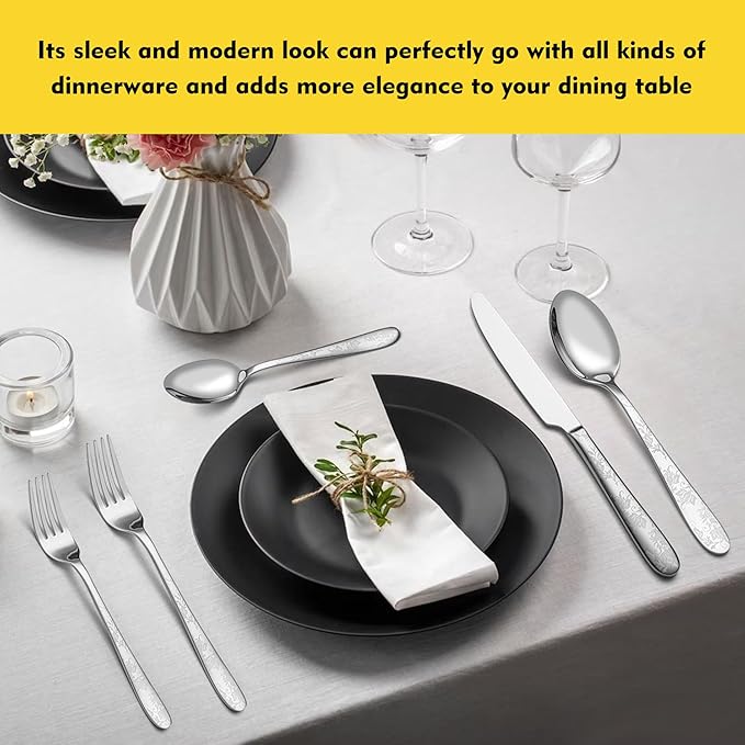 - 【Unique Silverware Set with Beautiful Pattern Handle】Our flatware set for 8 is designed with beautiful laser prints of flowers, unique styles make your dining table special, standing out from the ordinary tableware, and unique silver finish pattern design brings modern and stylish to the silverware sets impresses your family and friends when they come round for dinner