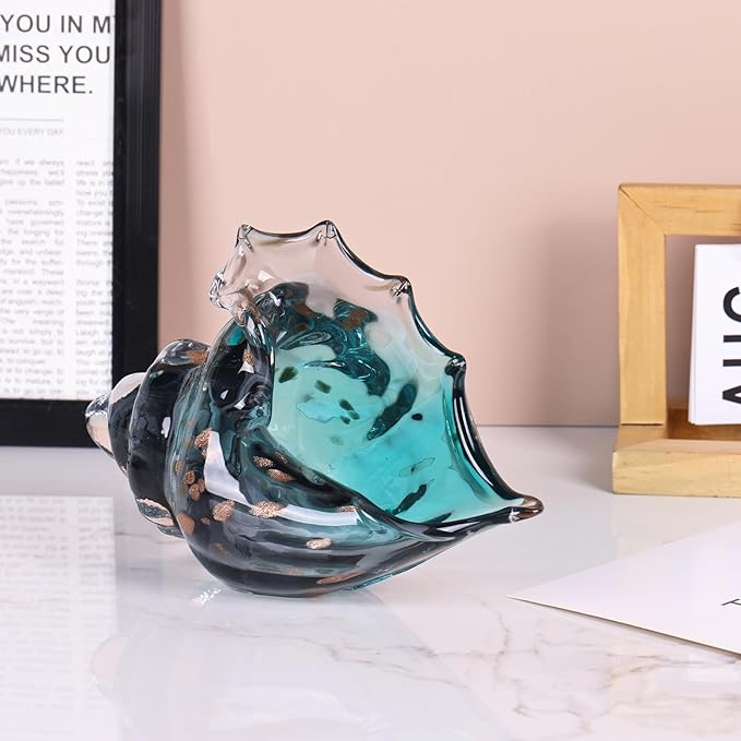 Sea Glass Art Figurines Hand Blown Conch Shell Sculpture, Green Glass Decor Creative Seashell Statue - for Coastal Room Knick Knacks, Home Kitchen Decorations Above Cabinets
