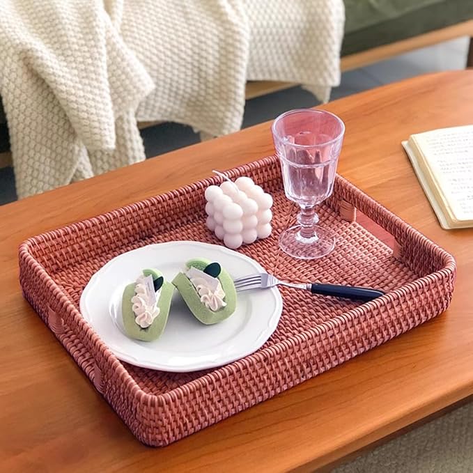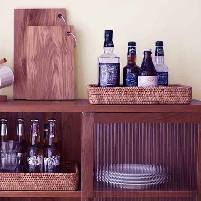 - Widely Applicable Rattan Organizers Storage Basket: Retro brown and suitable size boho decorative tray is perfect for the kitchen, lobby, party, cocktails, office, coffee table, or bedroom to organize bread, fruit, towel, soap, other odds and ends.
