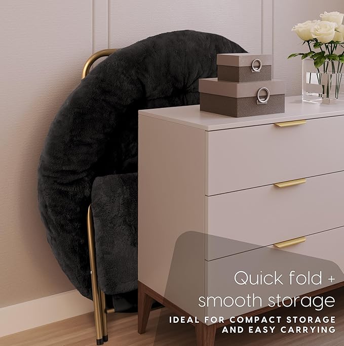 - Quick And Easy: Enjoy your new chair as soon as it arrives! Folds for convenient storage and easy transportation – because you’ll never want to be without it once you try it. Features faux fur fabric on a sturdy metal frame and measures 38” x 25” x 34”.