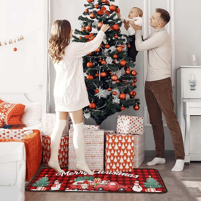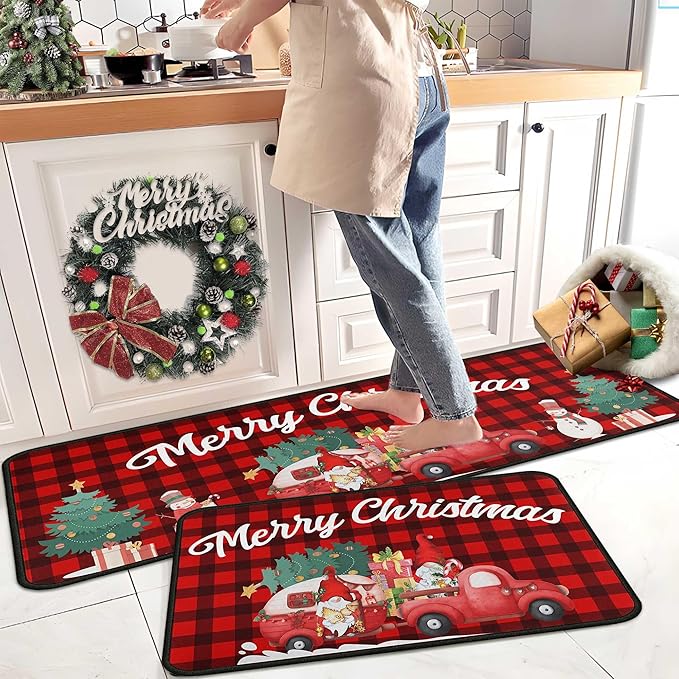 Buffalo Plaid Red Truck Christmas Kitchen Rugs 2 PCS, Merry Christmas Kitchen Rug, Non Skid Washable Soft Comfort Kitchen Rugs Set (17"x47"+17"x30",Merry Christmas)