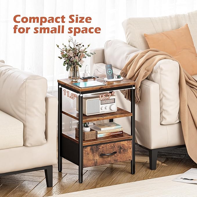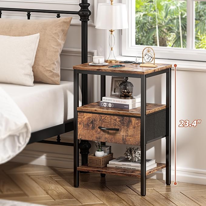 - [Go for a Long Time]: Rustic brown wooden grain shelves blend black fabric and metal frame, making it a timeless classic. Sturdy P2 particle board, sturdy metal frame, and durable fabric drawer, all these work excellently to give this side table with charging station strong support