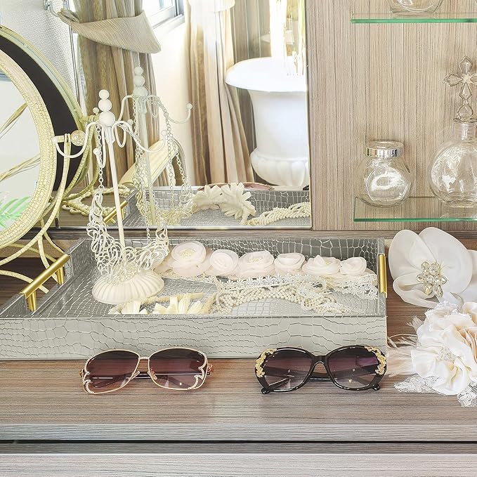 17" x 12" Wood Serving Tray with Gold Polished Metal Handles, Home Decorative Wooden Rectangle Ottoman Leather Decor Platter Bathroom Vanity Tray for All Occasions Alligator Silvery