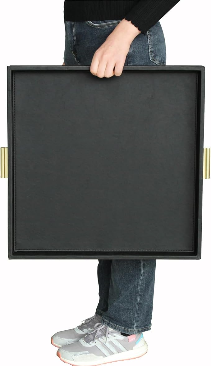HofferRuffer Elegant Decorative Serving Tray, 20"x20" Square Faux Leather Ottoman Tray with Gold Hardware Handles, Coffee Table Serve Tea, Coffee or Breakfast (Black)