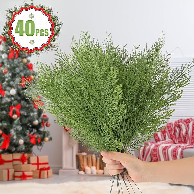 Hananona Artificial Pine Branches,40 Pcs Christmas Faux Cedar Stems, Artificial Faux Cedar Branches, Fake Christmas Greenery Pine Picks for Wreath Craft DIY Home Kitchen Decorations (40, Green)