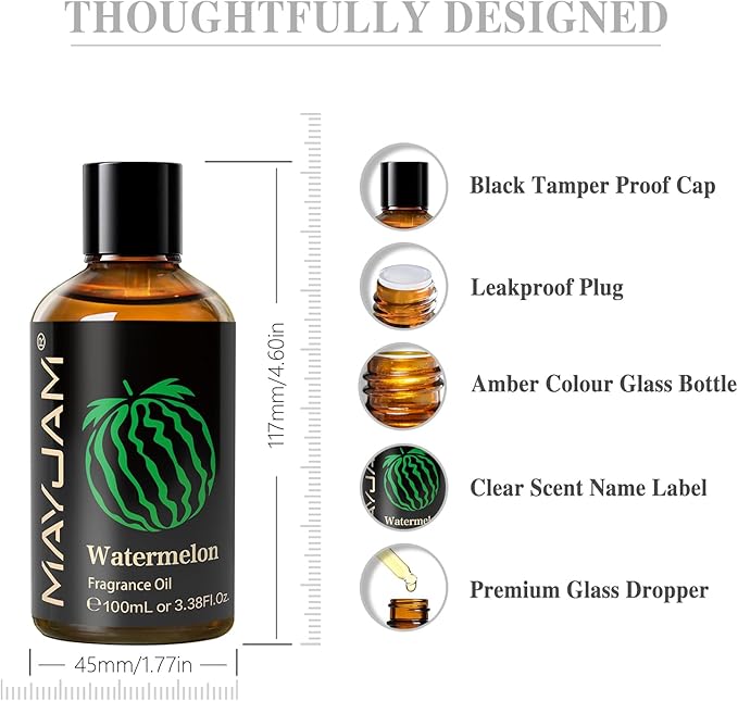 - Thoughtful Design: Each Watermelon fragrance oil is bottled in 100ML amber glass bottle to help keep the fragrance lasting. It also comes with a premium quality glass dropper to help you get the exact amount you want.