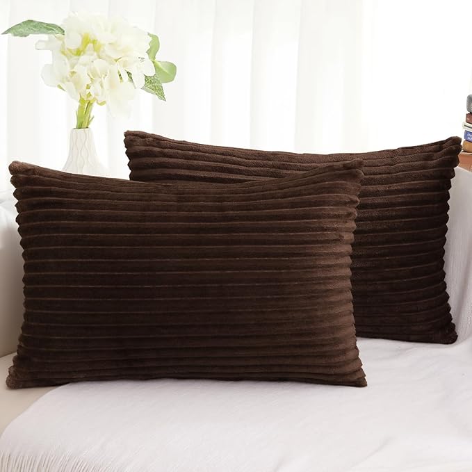 Simmore Decorative Throw Pillow Covers 12x20 Set of 2, Soft Natural Plush Flannel Double-Sided Fluffy Lumbar Pillow Covers for Couch Sofa Living Room, Brown