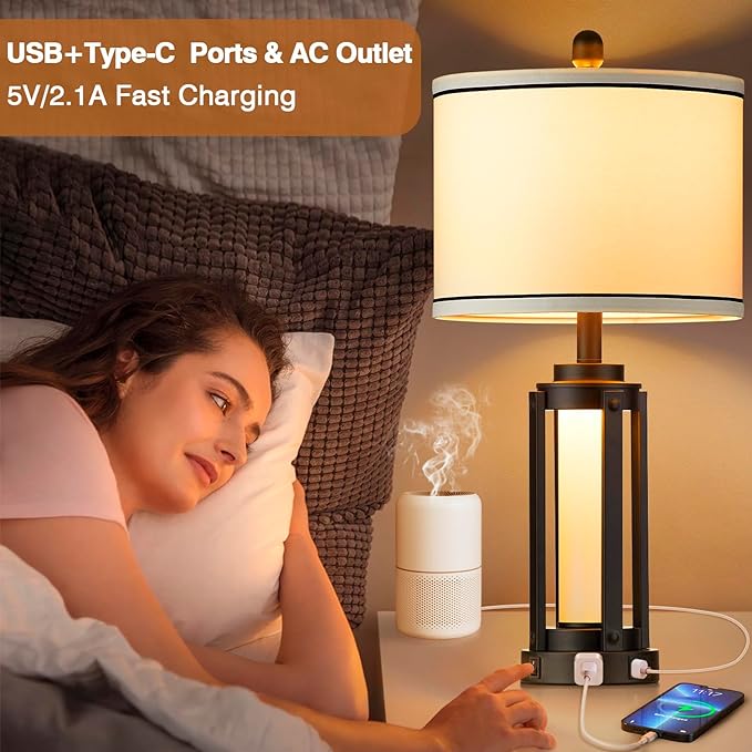 - Upgrade Fast USB+Type-C Ports & AC Outlet: Bedroom table lamps built-in 5V 2.1A speedy ports can charge mobile phones, tablets, Kindle readers, humidifier, and other devices without the hassle of searching for spare outlets. Keeping your side table clutter-free by powering up electronics through the lamps base, whether the lights are on or off. The perfect integrated ports allowing the lamps to charge devices while providing cozy illumination for reading nooks and living spaces!