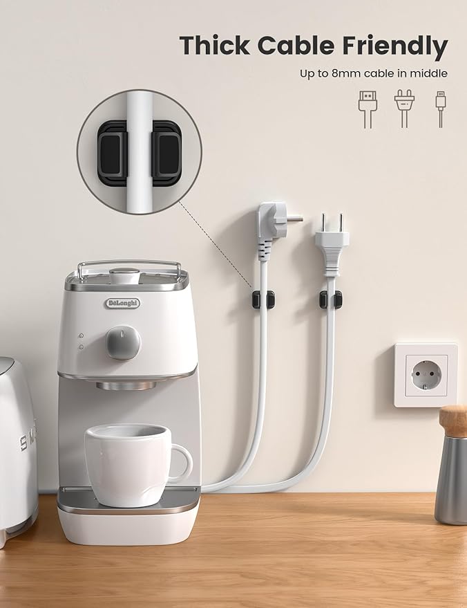 - Thoughtful Wide Compatibility: The extension length of the middle spring clip is 2.5-8mm (0.1-0.32inch), this desk cord holder spring clip can be applied to almost all the household cables, including iPhone charger cables, USB cords, HDMI thick cables,computer power cords, ethernet cable, etc. The both sides hole holder supply to the small cable which diameter is 3mm-5mm.