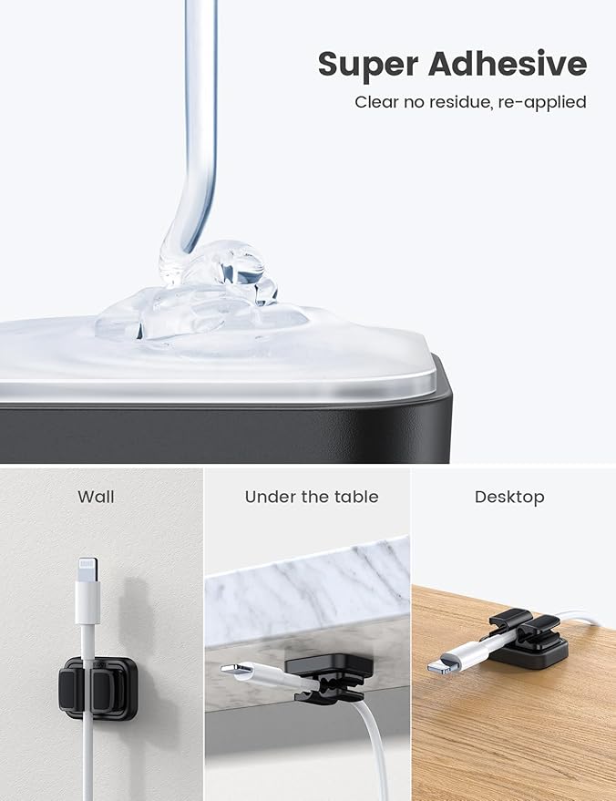 - Sturdy Acrylic Adhesive Pad: This cable management featured with a strong Acrylic adhesive pad tape that can sturdily adhere to any clean surfaces and hold various wire cords stably. Also the stickers can be clearly removed and replaced, allowing to easily change the clip location without residue adhesive or damage on desk, wall, nightstand, car, office, etc.