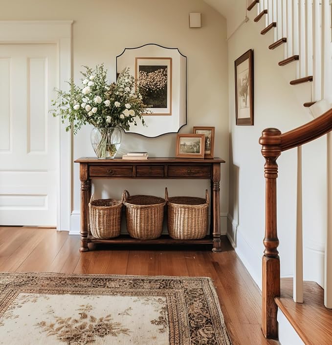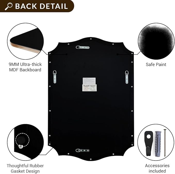 - 【Premium Stainless Steel Craftsmanship】: (N.W:17LBS). Crafted from stainless steel metal with oxidation-resistant properties, this black vanity mirror offers enhanced stability and a longer lifespan. Shatterproof 4mm HD glass is supported by a 9mm MDF backboard (most others just 3mm ), surrounded by a 1/17" gap with the scalloped corner design to give a seamless finish