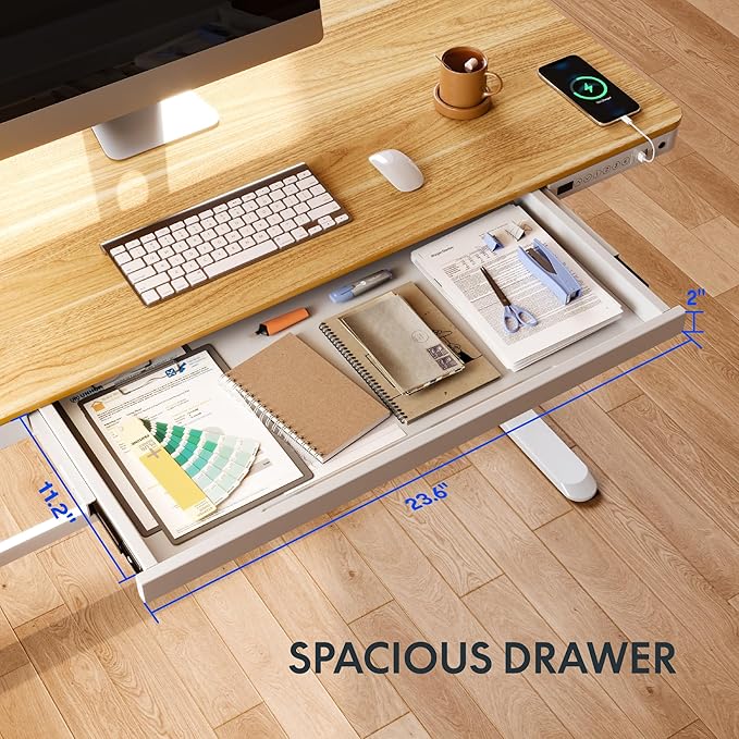 FLEXISPOT Electric Standing Desk with Drawer Storage Adjustable Height Quick Assembly Table w/USB Charge Ports, Child Lock (Natural Desktop + White Frame)