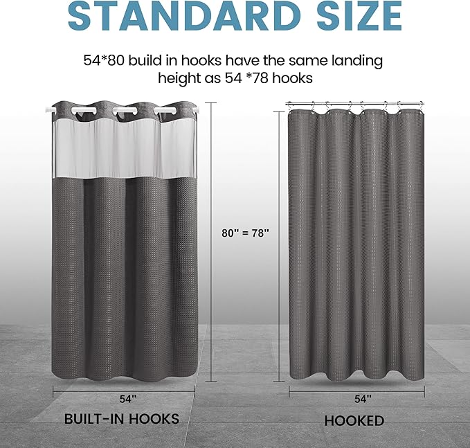 - 【Dimensions】54W * 80H inch (137W * 203Hcm); Measures: 54" width by 80" length fits your standard sized bathroom, snap in liner is 53" x 60" (WxL). Package Included: 1 Shower curtain and 1 fabric snap-on replacement Liner,2 bottom magnets on both corners
