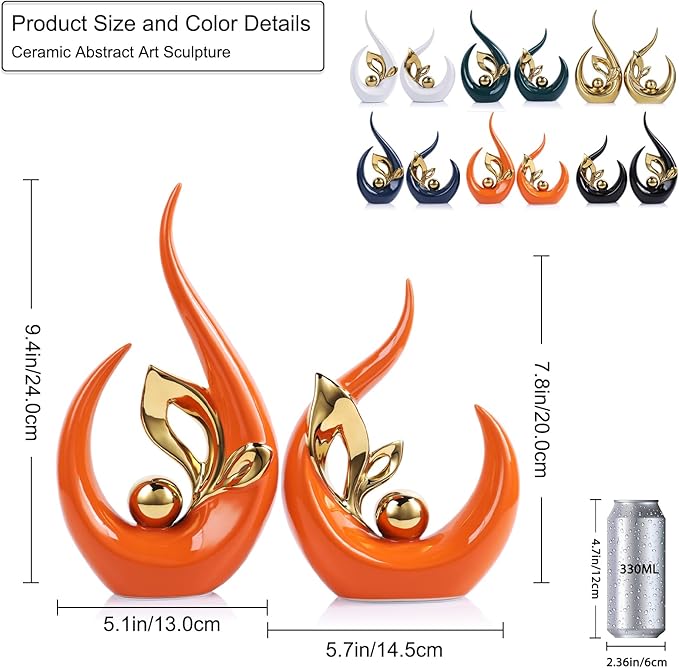 - Striking Centerpieces: This set of Orange and gold abstract ceramic sculptures, available in large (H9.4 x L5.1 inches) and small (H7.8 x L5.7 inches) sizes, serves as dynamic centerpieces for tables or dining room table centerpiece. Their fluid form and lustrous gold accents make them a luxurious addition to any center table decor or coffee table centerpiece decor.