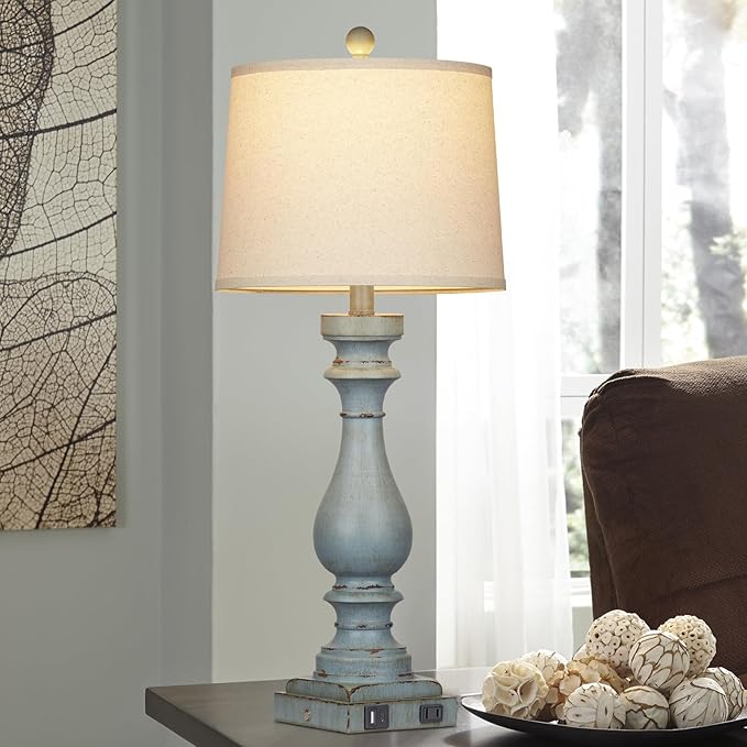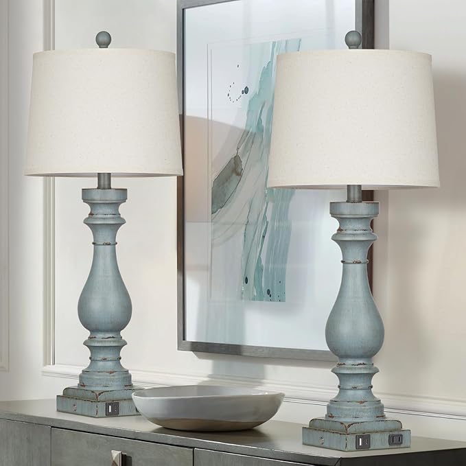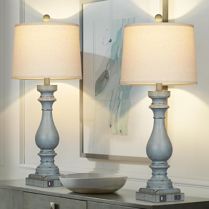 29" Tall Table Lamp for Living Room Set of 2,Coastal Bedside Nightstand Lamps with USB C+A Ports & AC Outlet,3-Way Dimmable Touch Control Retro Blue Desk Lamp for Bedroom,Color 3