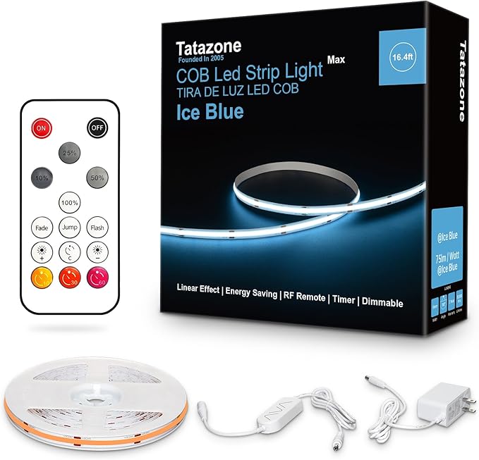 16.4ft Ice Blue COB Led Strip Lights with RF Remote, Dimmable Bright Adhesive Indoor Led COB Light Strip for Cabinet, Painting, Room, Bed