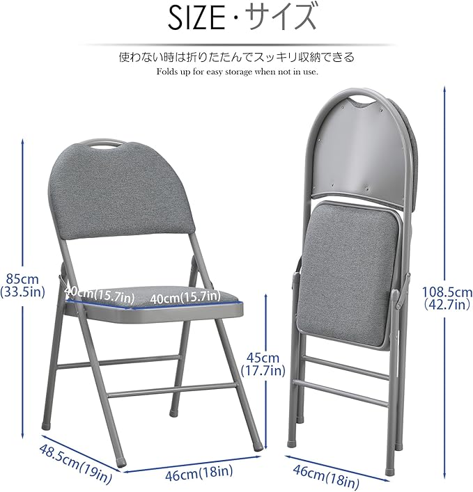 - 【High Back Design】 We've enhanced the backrest size to provide added support and comfort, making these chairs an ideal choice for longer seating periods. Dimensions: 18" W x 19"D x 33.5"H (46x48.5x85cm) Folding Dimensions: 18"W x 42.7"H (46x108.5cm) Load Capacity: about 299 lb