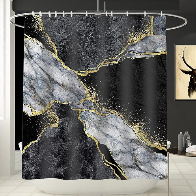 - ★【Installation and Dimensions】Installation for our shower curtain is a breeze. The black gold marble set comes with 12 rust-resistant metal grommets and 12 sturdy white hooks. These rust-resistant metal grommets prevent the marble curtain from tearing, ensuring better durability and a longer lifespan. The 72"x78" size is suitable for all standard bathtubs and shower stalls, whether they have straight or corner shower rods.