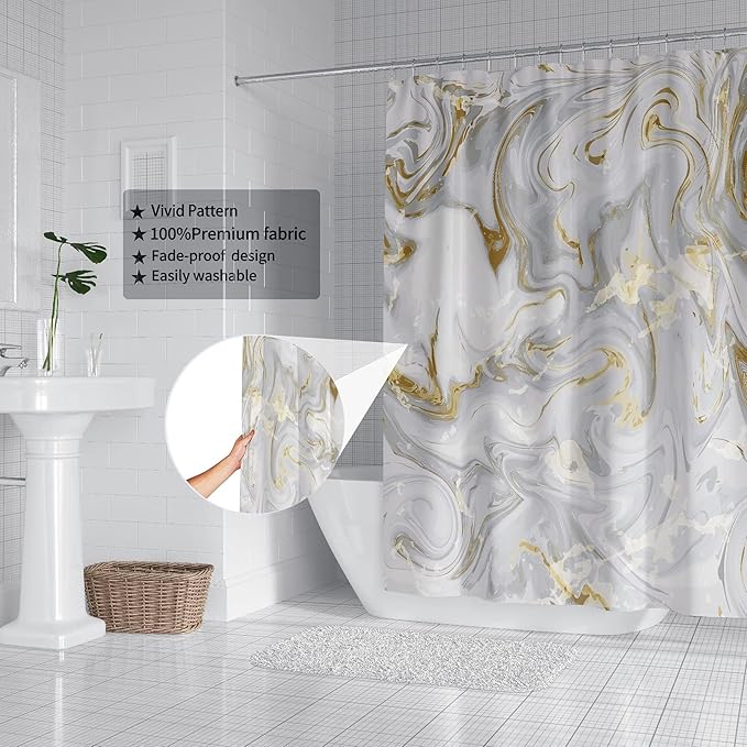 - ★【Installation and Dimensions】Installation for our shower curtain is a breeze. The gray gold marble set comes with 12 rust-resistant metal grommets and 12 sturdy white hooks. These rust-resistant metal grommets prevent the marble curtain from tearing, ensuring better durability and a longer lifespan. The 36"x72" size is suitable for all standard bathtubs and shower stalls, whether they have straight or corner shower rods.