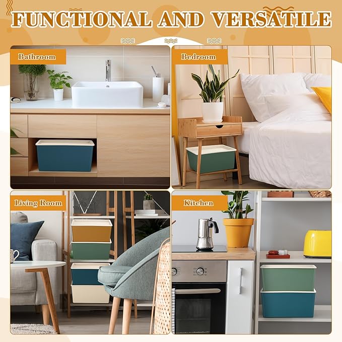 - Appealing and Functional: use these storage bins with lids to store cleaning supplies, records and books, art and craft supplies or other items that need a home without creating a mess; You can use them in any room of the home, such as in kitchen, closet, pantry, craft rooms, laundry rooms, bedrooms, bathrooms, kitchens, offices, garages, playroom and more