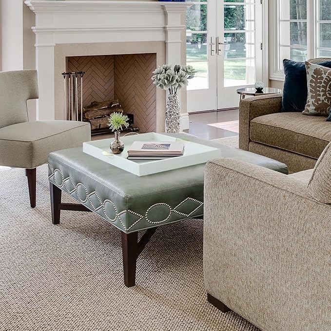 - Decorative tray for serving your favorite foods and beverages atop your ottoman or coffee table; Boasts an ample serving area with high sides and cutout handles; Ribbed base is an attractive accent that inhibits items from sliding around.