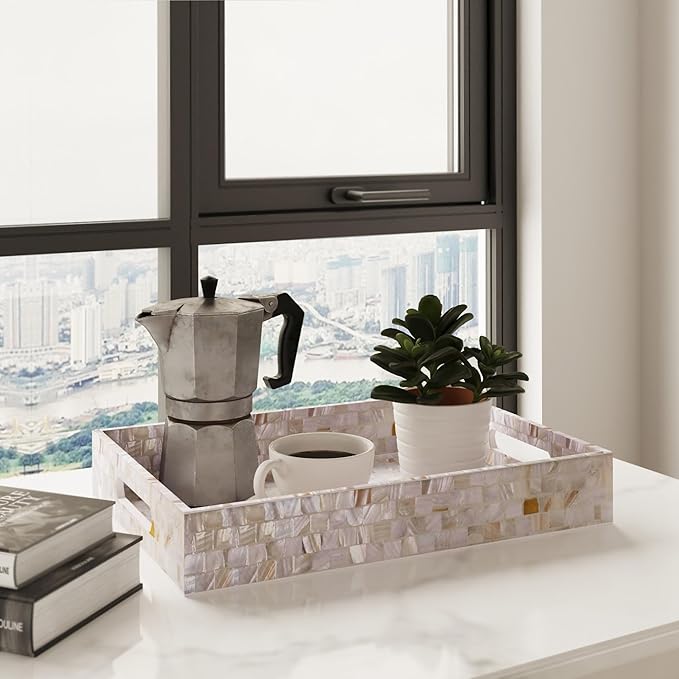 - [BEAUTY & FUNCTION] The special mother of pearls coating textures and colors adds oriental character and a luxury touch to many styles of decor. It will be much more beautiful under lights as nacre reflects lights into different colors, making this decorative wooden ottoman serving tray a perfect decorative tray for coffee table, and unique serveware centerpiece for the dining table, dining table, bathroom, living room and your home or events. PEMAR rectangular coffee trays with handles are great boho farmhouse rustic decorative trays available.