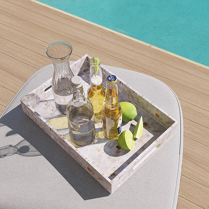PEMAR Rectangular Mother of Pearl Serving Tray Nacre Wood Lap Ottoman Tray for Coffee Table, Luxury Decorative Handmade Eating Platters w Insert Handles (White Cream)