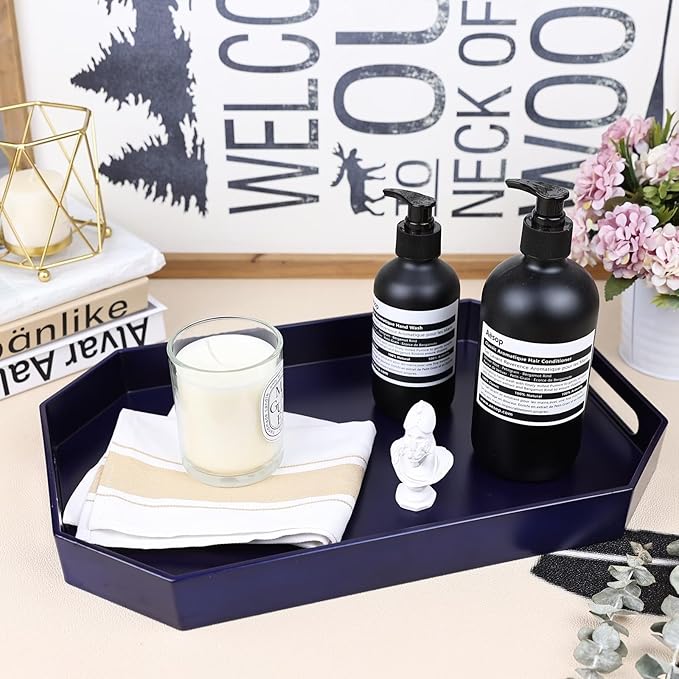 Navy Blue Octagonal Serving Tray with Handles for Coffee Table, Plastic Decorative Tray for Ottoman, Kitchen Counter, Living Room, Outdoor Lacquer Tray for Entertaining