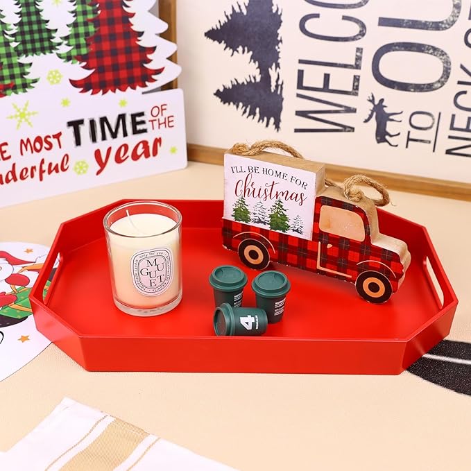 Red Octagonal Serving Tray with Handles for Coffee Table, Plastic Decorative Tray for Ottoman, Kitchen Counter, Living Room, Outdoor Lacquer Tray for Entertaining