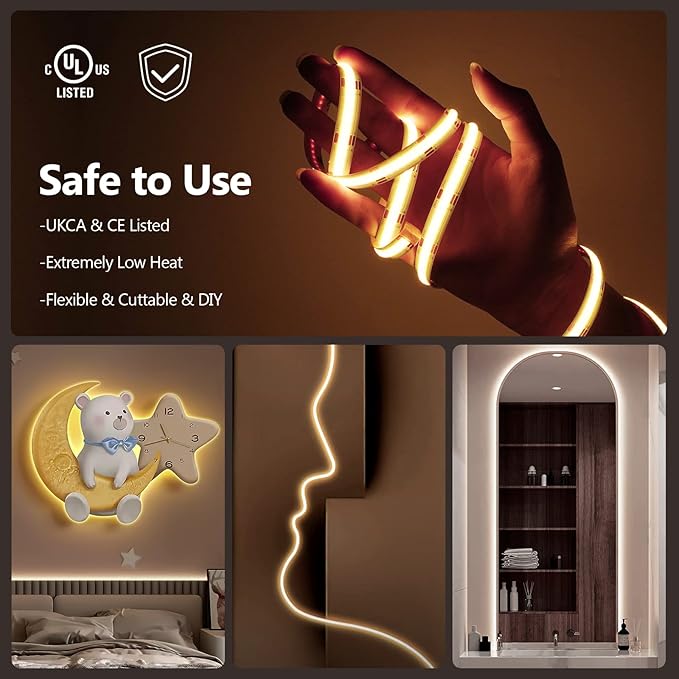 - High Quality: The cob led strip has better heat dissipation than others, it's safe for children and pets. Higher color rendering index (CRI90+), lower power, 180 degree beam angle design for 50% wider illumination, Lifespan >60,000 hours