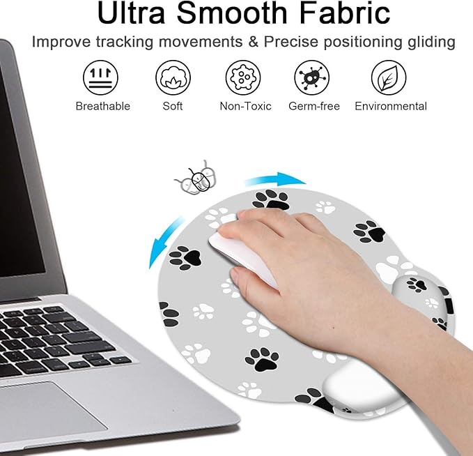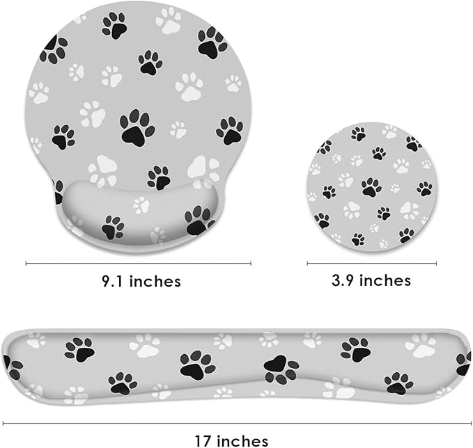 Britimes Ergonomic Mouse Pad Set with Wrist Rest Gray Paw Print Non-Slip Rubber Base Wrist Cushion Support and Coasters Mousepad with Wrist Support for Computer Keyboard and Desk