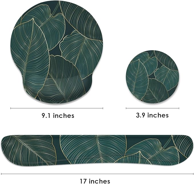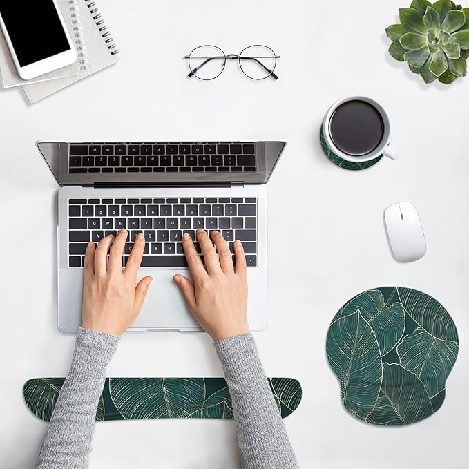 Britimes Ergonomic Mouse Pad Set with Wrist Rest Green Palm Leaves Non-Slip Rubber Base Wrist Cushion Support and Coasters Mousepad with Wrist Support for Computer Keyboard and Desk