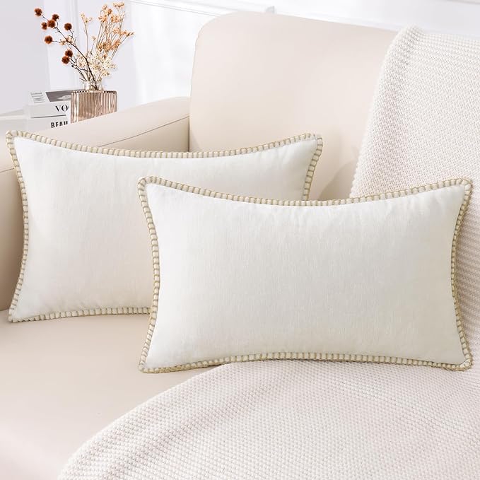 decorUhome Chenille Soft Throw Pillow Covers 12x20 Set of 2, Lumbar Velvet Farmhouse Neutral Decorative Euro Pillow Covers with Stitched Edge for Couch Sofa Bed Home Decor, Cream White