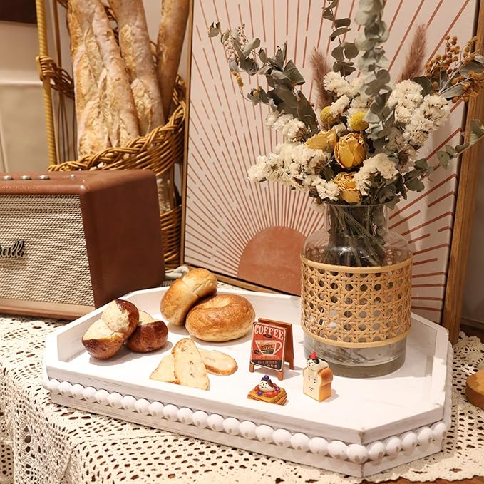Whitewashed Wood Serving Tray with Beads, Farmhouse Decorative Tray for Table Centerpiece, Christmas Wedding Halloween Home Decor