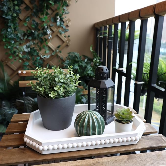 White Wood Serving Tray with Beads, Farmhouse Decorative Tray for Table Centerpiece, Christmas Wedding Halloween Home Decor