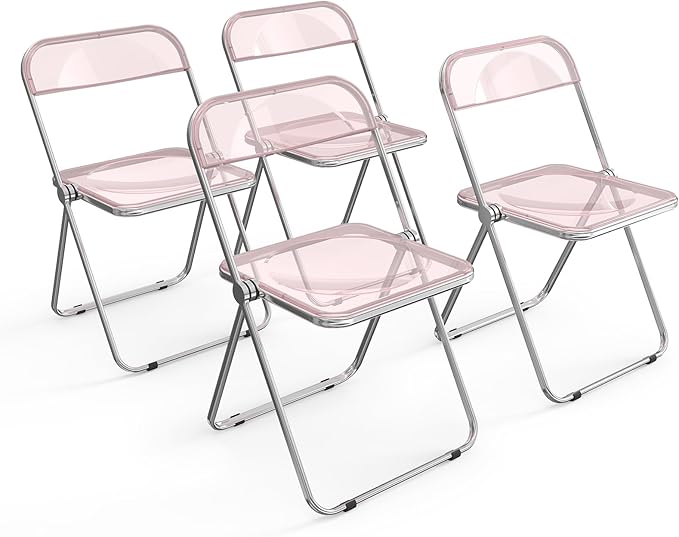 VINGLI Acrylic Folding Chairs 4 Pack, Clear Chair Foldable and Stackable, Plastic Panel & Metal Chrome Frame, Weight Capacity 350 lbs, Pink