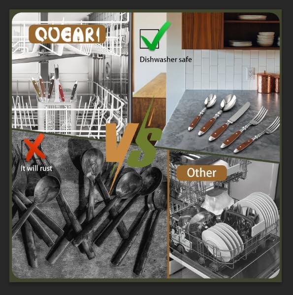 - CLASSIC RIVET HANDLE - The handle of the tableware is colored by electroplating to ensure that it does not fade or fade for a long time. The two rivets on it increase the firmness and add a sense of delicacy to the handle design.The whole body of the tableware is welded in one piece, no matter how it is used, it will not be easily damaged.